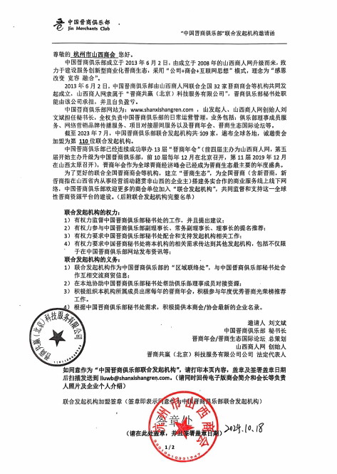 10月18日,中国晋商俱乐部秘书处收到了杭州市山西商会的加盟回执。