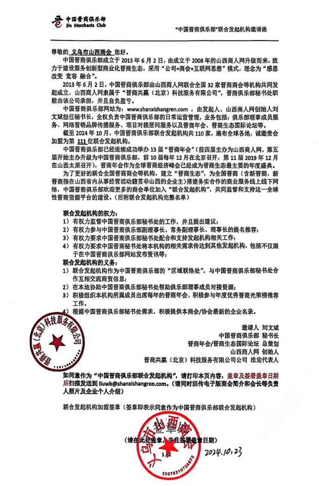 10月23日,中国晋商俱乐部秘书处收到了义乌市山西商会的加盟回执。