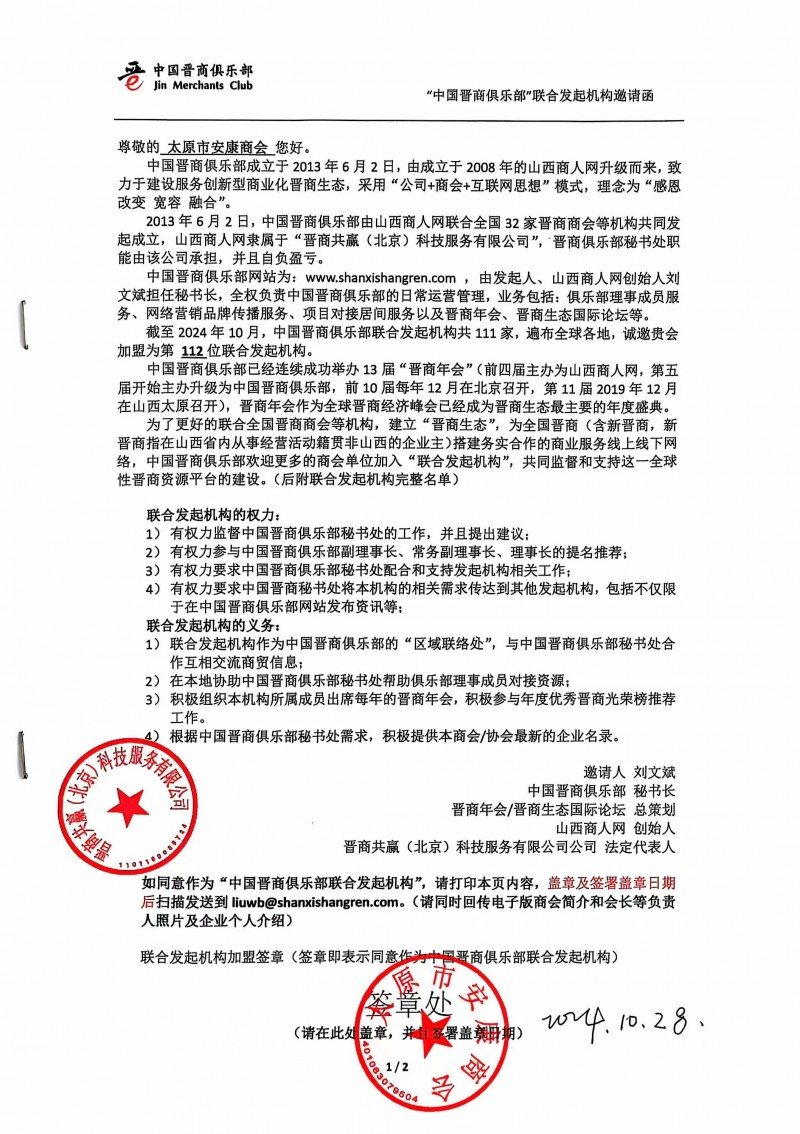 10月28日,中国晋商俱乐部秘书处收到了太原市安康商会的加盟回执。