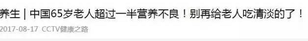 中国疾病预防控制中心营养与食品安全所有关专家指出,我国老年人营养状况令人担忧,超过一半的老人存在营养不良风险,我国曾按照国际通用的营养不良筛查标准,针对北京、上海、广州、重庆、成都5个城市65岁以上老人进行营养状况调查后发现,超过50%的人存在营养不良风险,“这5个城市都是发展较好、生活水平较高的城市,农村的情况一定更为严峻。(本段摘自环球网)