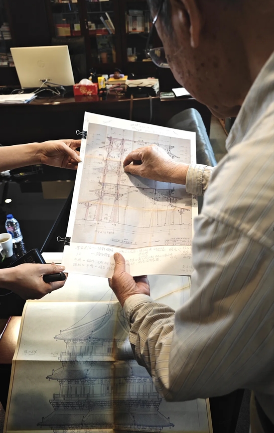 采访的最后,江欢成向记者展示应县木塔的图纸,并表示,这些都是他的宝贝,山西古建筑保护研究院古建研究的工作做得非常仔细,他们功不可没。