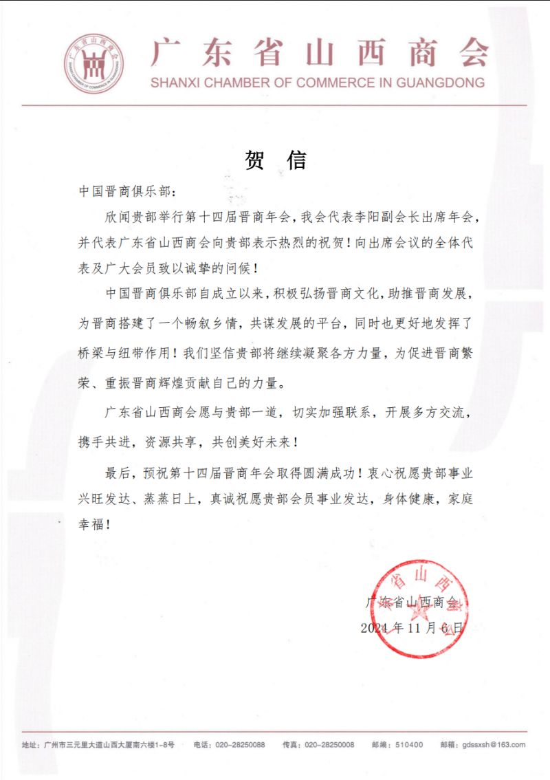 11月6日,广东省山西商会向中国晋商俱乐部发来贺信,预祝2024第十四届晋商年会圆满成功。