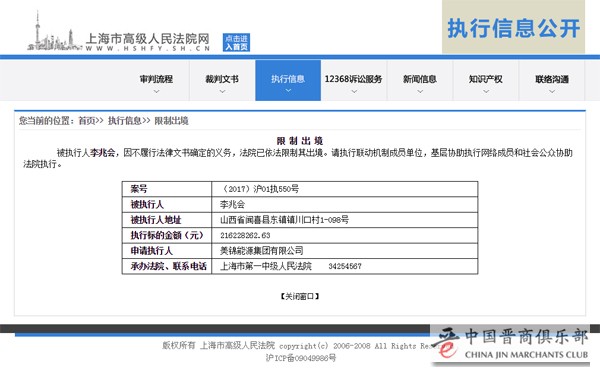 核心提示:被执行人李兆会,因不履行法律文书确定的义务,法院已依法限制其出境。请执行联动机制成员单位,基层协助执行网络成员和社会公众协助法院执行。申请执行人:美锦能源集团有限公司
