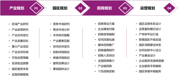 公司提供招商后服务,以构建生态链产业创新服务平台为目标,建立以企业为中心的全周期综合运营服务体系,构建出园区“两大服务体系,三大服务类型”,打造有活力、有态度、有温度的产业园区。