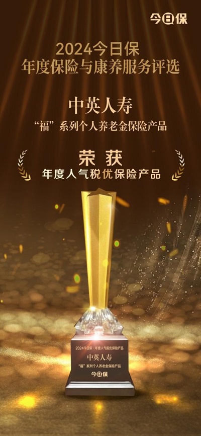 近日,在 “2024 今日保・年度保险与康养服务评选” 活动中,中英人寿 “福” 系列个人养老金保险产品凭借优异的市场表现和客户的充分信赖,成功荣膺 “年度人气税优保险产品” 称号。该活动由《今日保》与今日保研究院共同举办。