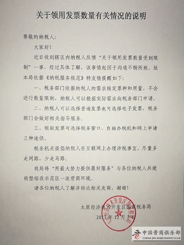 12月7日,太原经济技术开发区国家税务局正式发出了关于领用发票的说明,并且委托中国晋商俱乐部秘书处进行发布,希望在综改区发展的更多企业及友商可以准确了解。中国晋商俱乐部秘书长刘文斌认为,“快速、及时、坦诚”的交流方式反映了太原经济技术开发区国家税务局“最大努力做好服务”的一种具体表现,相信双方一定能够在彼此合作打造山西综改区一流营商环境方面务实交流与合作。