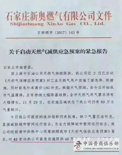 石家庄新奥燃气有限公司文件《关于启动天然气减供应急预案的紧急报告》文件分享如下: