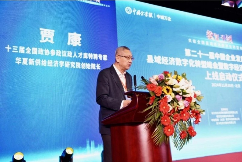 十三届全国政协参政议政人才库特聘专家、华夏新供给经济学研究院创始院长贾康在作主题演讲时深入解析了国家数字化转型的战略布局、政策导向及未来趋势,为县域经济发展提供宏观指导。他表示,在数字经济形成的新质生产力的推动下,县域经济转型发展取得了显著成效。然而,我们也要清醒地认识到,县域经济的数字转型发展仍然面临着诸多挑战和问题。对此,贾康提出了加强政策引导与规划、完善数字基础设施建设、加强人才培养与引进等六条建议,促进县域经济的数字转型与新质生产力深度融合。