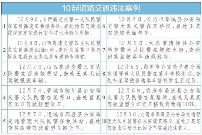 12月9日,山西省公安厅交管局曝光10起道路交通违法案例并提醒驾驶人:岁末年初物流运输业务繁忙、恶劣天气频发,驾车外出请严格遵守道路交通法律法规,安全文明出行。(记者陈俊琦)