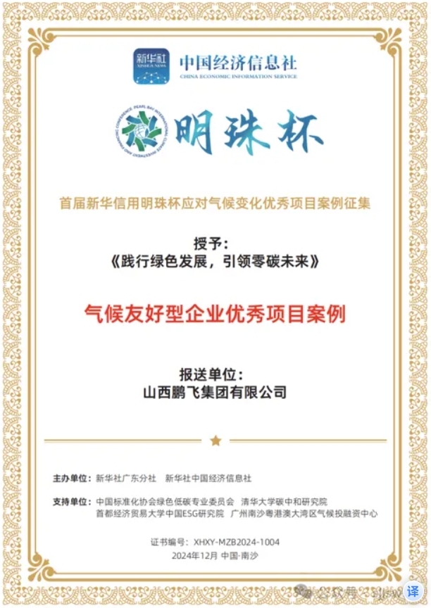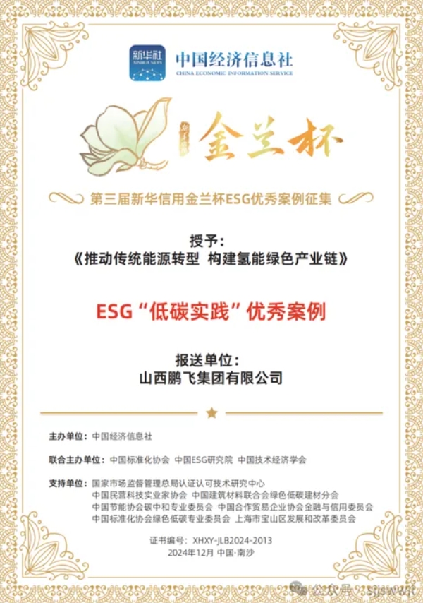 山西鹏飞集团有限公司(简称“鹏飞集团”)凭借其从传统能源到新能源的战略跃升、从传统产业向新质生产力的纵向进阶,以及零碳智慧物流的高效运作,其申报的《推动传统能源转型 构建氢能绿色产业链》和《践行绿色发展 引领零碳未来》分别入选第三届“新华信用金兰杯”低碳实践优秀案例和首届“新华信用明珠杯”气候友好型企业项目案例。