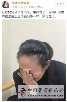 陪同江歌妈妈一起出庭的徐静波在微博上说,江歌妈妈从法庭出来,跟我说了一句话:陈世峰在法庭上居然跟没事一样,太冷血了。