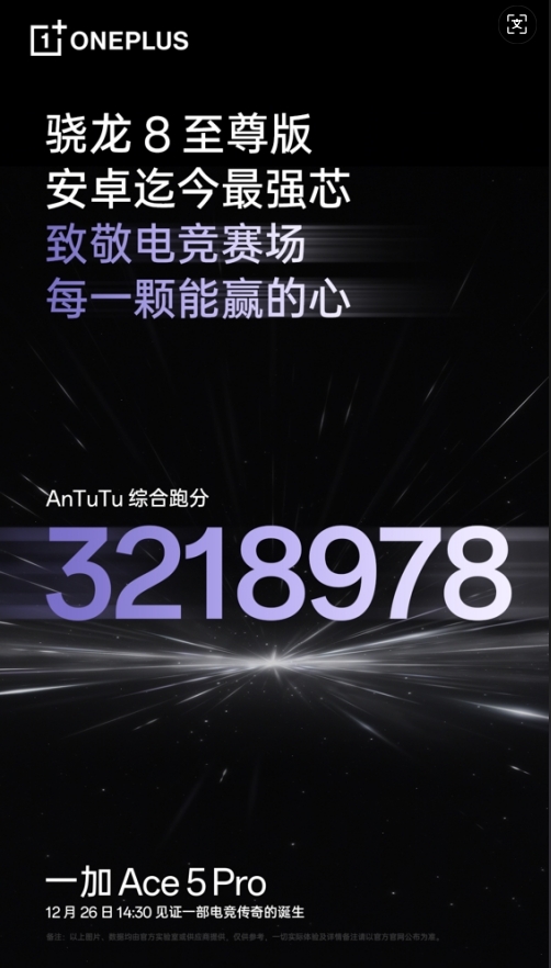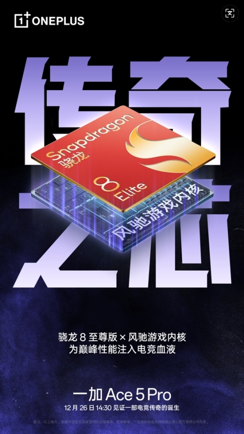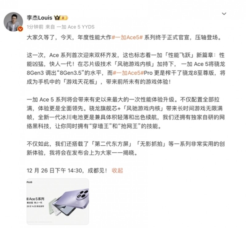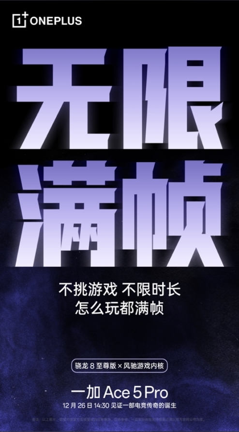 12月19日,一加官方宣布一加 Ace 5 系列正式定档 12 月 26 日,一加 Ace 5系列搭载骁龙旗舰平台和众多行业领先硬件配置,搭配行业首款芯片级游戏技术「风驰游戏内核」,以凶猛性能打造满级战力,性能表现断档领先。同时,一加官宣传奇电竞选手Uzi作为 Ace 系列首席电竞官,共同见证一部电竞传奇的诞生 。