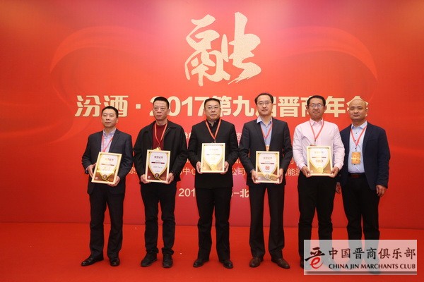 山西杏花村汾酒厂股份有限公司董事会秘书王涛(中)向2017晋商百优代表杜小彪、杜宪、窦小刚、柴红武颁奖