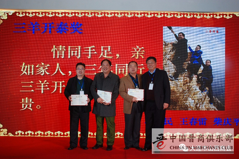 商会会长田东风给“三羊开泰奖”获奖者王春雷、段喜民、柴庆平颁奖