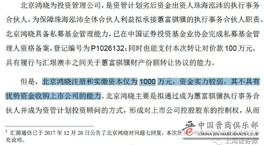 今年11月初,李红星出资700万元受让了韩笑所持的北京鸿晓70%股份,成为控股股东。之后,北京鸿晓斥资100万元受让了汇垠澳丰持有的蕙富骐骥的合伙份额,从而控制了上市公司。