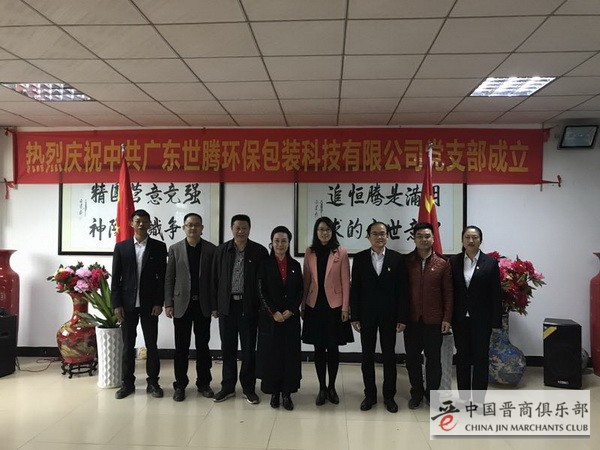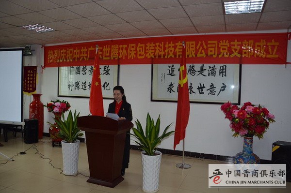 广东世腾包装公司董事长高山女士(中国晋商俱乐部副理事长),向到会祝贺的领导同志们致辞欢迎,表达了对党组织已久的敬仰心愿,对区镇各级党组织关心企业党支部的成立和发展表示衷心的感谢,并表示全力支持公司党建工作,把十九大精神贯彻到每个员工,为建设现代化经济体系做出新的贡献。