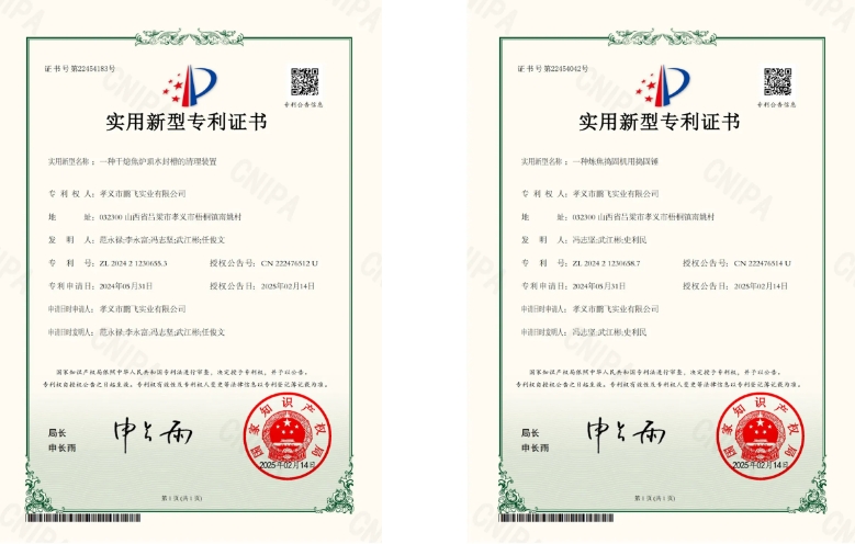近日,由鹏飞集团自主研发的“一种干熄焦炉顶水封槽的清理装置” 与 “一种炼焦捣固机用捣固锤”成功获得国家知识产权局授予的实用新型专利证书。至此,鹏飞集团已累计获取专利100余项。