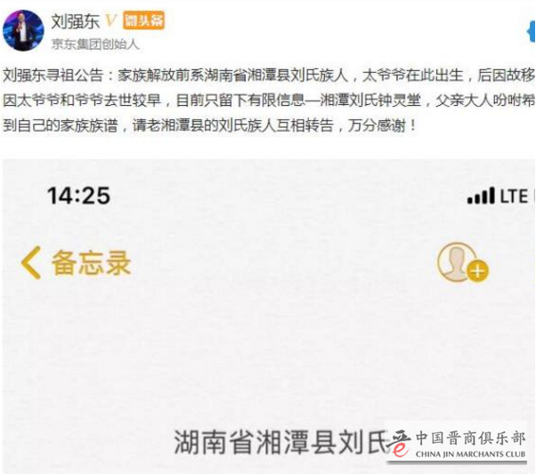 刘强东在公告中称,家族解放前系湖南省湘潭县刘氏族人,太爷爷在此出生,后因故移居江苏!因太爷爷和爷爷去世较早,目前只留下有限信息—湘潭刘氏钟灵堂,父亲大人吩咐希望能够找到自己的家族族谱,请老湘潭县的刘氏族人互相转告,万分感谢!