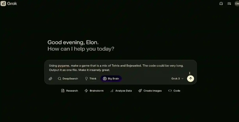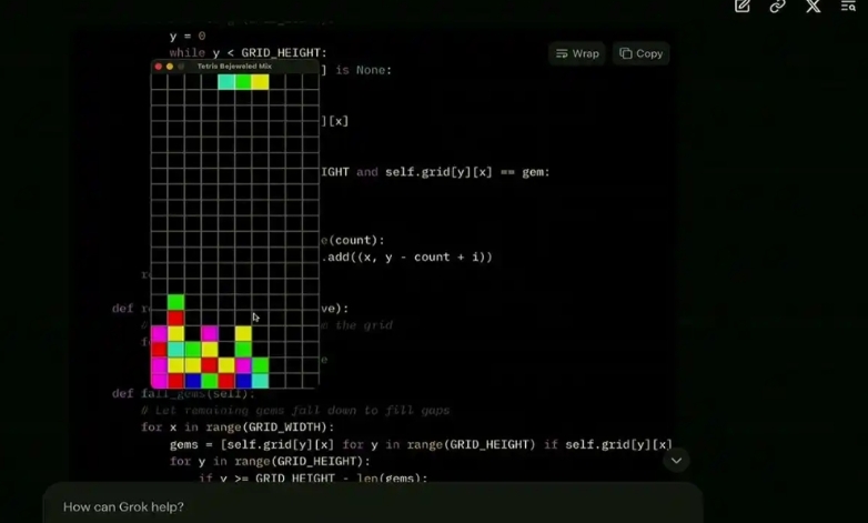 此外,马斯克团队要求Gork-3制作一款类似于俄罗斯方块的游戏。在Grok-3思考了数分钟后,给出了看起来不错的答案。