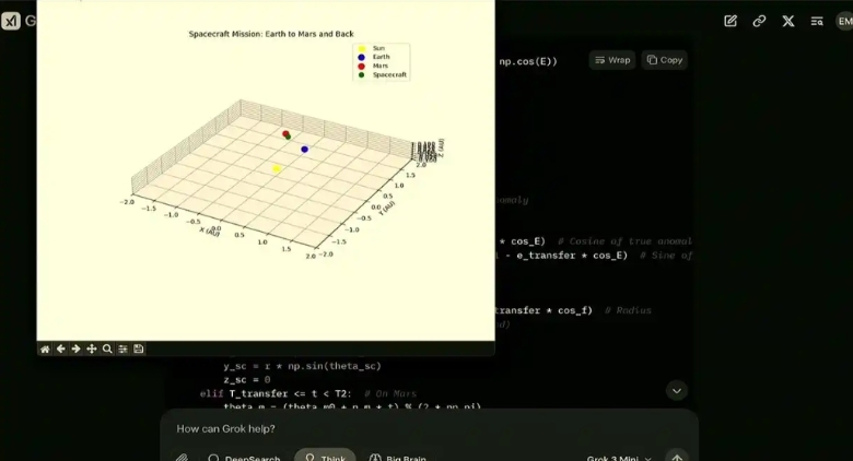 在Grok-3生成代码后,马斯克团队运行了这段代码。画面上显示出了飞船在地球和火星间往返的动画。