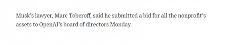 马斯克的律师马克·托贝罗夫此前表示,已向OpenAI董事会提交了该收购要约。