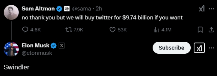 OpenAI首席执行官萨姆·奥尔特曼对此表示拒绝。奥尔特曼在社交媒体X上发帖称:“不了,谢谢。但如果你愿意的话,我们可以花97.4亿美元收购推特。”马斯克随后回复称奥尔特曼是“骗子”。