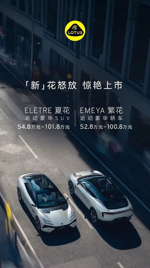 此后2月14日,莲花跑车正式发布更名后的两款新莲花车型,其中定位为“运动豪华轿车”的EMEYA繁花售价区间52.80-100.80万元,定位为“运动豪华SUV”的ELETRE夏花售价区间54.80-101.80万元。