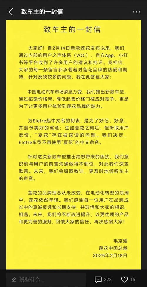 信中称,为ELETRE起中文名的初衷,是为了好记、好念并赋予美好的寓意:生如夏花之绚烂。但听取用户反馈,“夏花”存在被误读的问题。公司决定ELETRE车型不再使用“夏花”的中文命名。