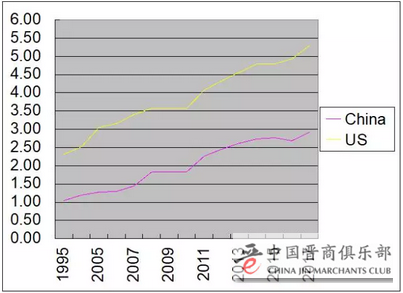 简单来说,就是统计全世界各地麦当劳的巨无霸汉堡的价格,把当地的价格用当时的汇率换算成美元价格。我们可以看到从1995年到2017年,中国的巨无霸价格从1美元涨到了2.5美元左右,美国本土的巨无霸价格也从2.3美元涨到5.3美元。