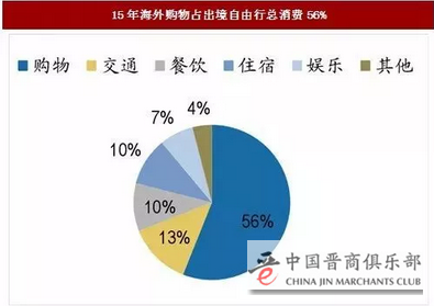 根据中国产业信息网的数据显示,出境游消费结构:购物、交通、餐饮、住宿占消费比重较高,其中,购物消费比重高达56%。