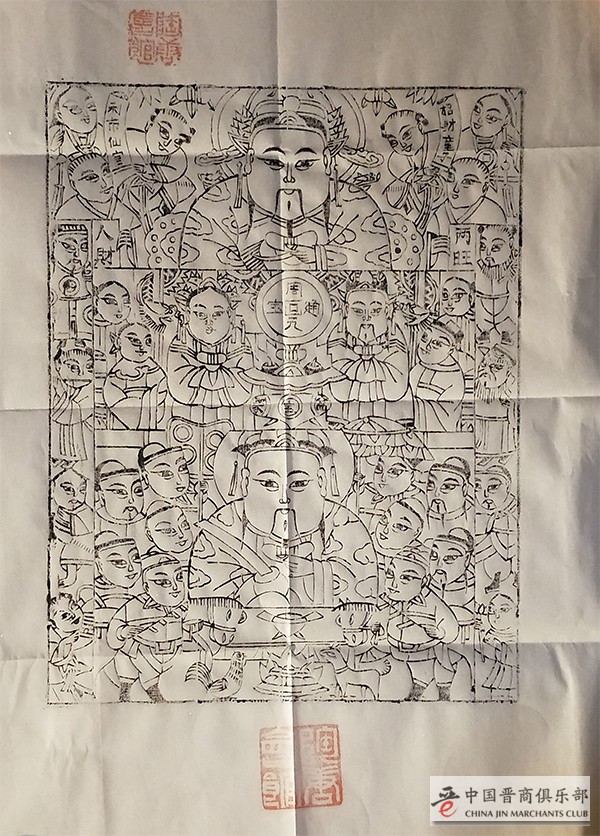 在会谈交流之后,赵军董事长特别介绍了自己收藏的清朝前期的平阳木板年画母板,该母板主题为“送财”,最多可以拓印1万张,目前可以拓印的次数已经不多,他特别赠送了刘文斌秘书长100副,希望刘文斌秘书长送给支持“晋商生态”建设的各位晋商,“送财”给大家。