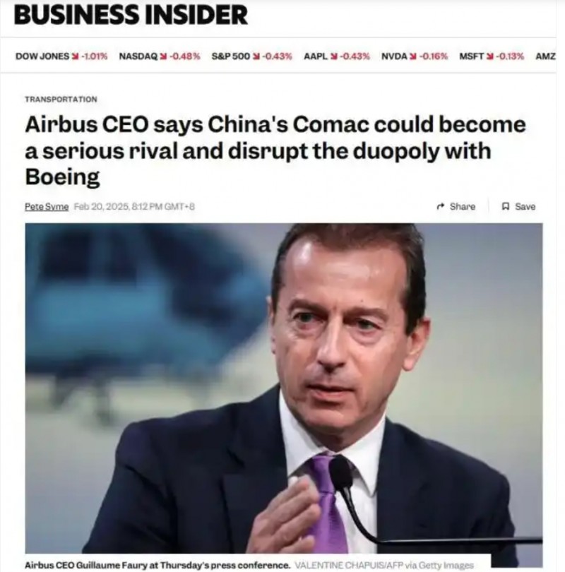 据《商业内幕》报道,空客CEO Guillaume Faury20日在空客年度业绩新闻发布会上表示,中国商飞可能成为成为空客的有力竞争对手,挑战空客与波音在飞机制造业的“双头垄断”地位。