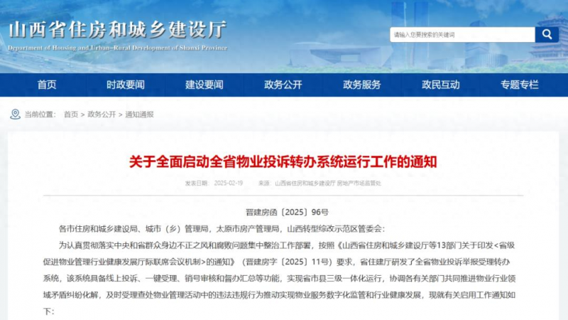各位!山西省全新上线的物业投诉举报受理转办系统已于2月20日正式启用!该系统支持线上投诉、一键受理、销号审核等功能,实现省、市、县三级联动处理,高效解决物业纠纷。您可通过电话、邮箱、12345热线或“三晋物业”APP、微信平台提交投诉,全程跟踪办理进度,确保每件投诉有落实、有反馈。