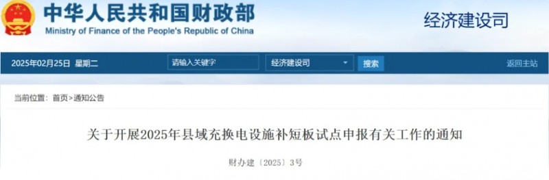 为加快补齐农村地区公共充换电设施短板,进一步释放新能源汽车消费潜力,2月25日,财政部办公厅、工信部办公厅、交通运输部办公厅发布了《关于开展2025年县域充换电设施补短板试点申报有关工作的通知》。