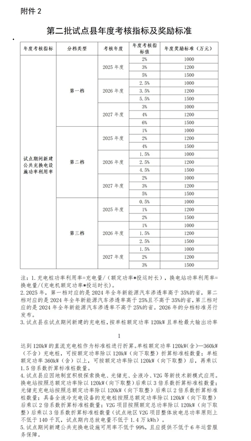 2025年计划支持75个试点县。三部门根据地方当前新能源汽车和公共充换电设施发展状况及未来潜力、地域面积、省内县(县级市)数量、当前财力状况、2024年试点省公共充换电设施接入新能源汽车公共充换电基础设施奖励资金清算平台(以下简称清算平台)情况以及2024年绩效考核结果等因素分配省级试点县名额(见附件1)。