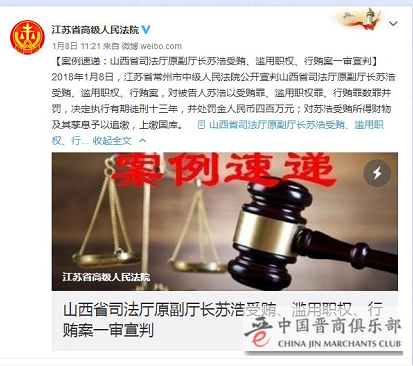 日前,江苏省常州市中级人民法院公开宣判山西省司法厅原副厅长苏浩受贿、滥用职权、行贿案,对被告人苏浩以受贿罪、滥用职权罪、行贿罪数罪并罚,决定执行有期徒刑十三年,并处罚金人民币四百万元;对苏浩受贿所得财物及其孳息予以追缴,上缴国库。