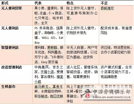 在新零售发端的今天,已经出现了多种新零售种类,主要分为无人便利货架,无人便利店,智慧便利店,改造型便利店,生鲜超市等五种类型。大型互联网公司,传统的零售巨头,大型购物中心,新型互联网销售公司,夫妻老婆店等等,各种类型的零售业线上线下主体都加入到了这场没有硝烟的战争当中。