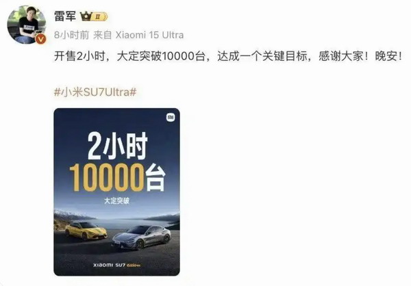 2月28日凌晨,小米创办人,董事长兼CEO雷军宣布,小米SU7 Ultra开售2小时,大定突破10000台,达成一个关键目标。