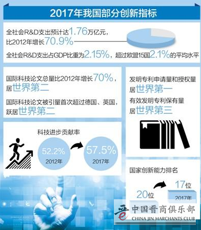 万钢在报告中指出,5年来,我国科技创新能力显著提升,主要创新指标进入世界前列。2017年,全社会R&D(研究与试验发展)支出预计达到1.76万亿元,比2012年增长70.9%;全社会R&D支出占GDP比重为2.15%,超过欧盟15国2.1%的平均水平。国际科技论文总量比2012年增长70%,居世界第二;国际科技论文被引用量首次超过德国、英国,跃居世界第二。发明专利申请量和授权量居世界第一,有效发明专利保有量居世界第三。全国技术合同成交额达1.3万亿元。全国高新技术企业总数超过13.6万家,研发投入占比超过全国的50%,发明专利授权量占比全国40%,上缴税费预计超过1.5万亿元,营业总收入预计超过30万亿元,增长均达到10%以上,提供就业岗位超过2500万个。科技进步贡献率从2012年52.2%升至57.5%,国家创新能力排名从2012年第二十位升至第十七位。
