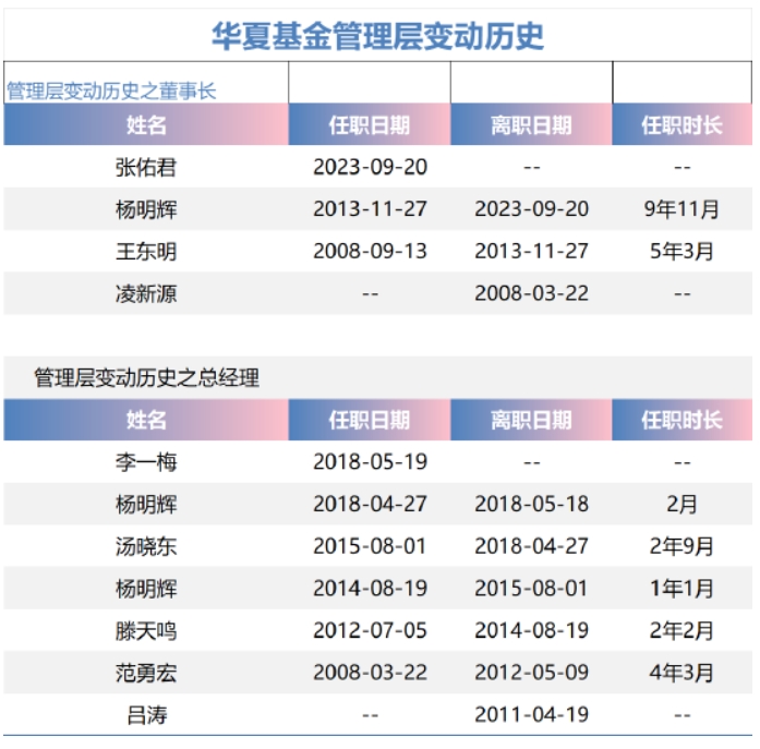 2013 年,杨明辉出任华夏基金董事长,开启了公司发展的新篇章。在他的领导下,华夏基金在巩固传统业务优势的基础上,积极拓展创新业务,加强国际化布局,提升公司的综合竞争力。他推动公司在 ETF 业务、跨境投资等领域取得了重要进展,使华夏基金在行业内保持领先地位。在他的任期内,华夏基金有高潮有低谷,整体看资产管理规模不断扩大,产品线日益丰富,投研能力和市场影响力进一步提升。在其任职期间,总经理有滕天鸣,和汤晓东,任职2年多,之后2018年李一梅上任,坚定布局ETF业务,在各业务方面稳健发展,带领华夏基金由行业第九重回行业第二。