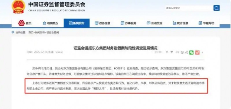 2月28日,证监会通报东方集团财务造假案阶段性调查进展情况,去年6月20日监会对东方集团立案调查。现已初步查明,东方集团披露的2020年至2023年财务信息严重不实,涉嫌重大财务造假,可能触及重大违法强制退市情形。该案目前正在调查过程中,证监会将尽快查明违法事实,依法严肃处理。