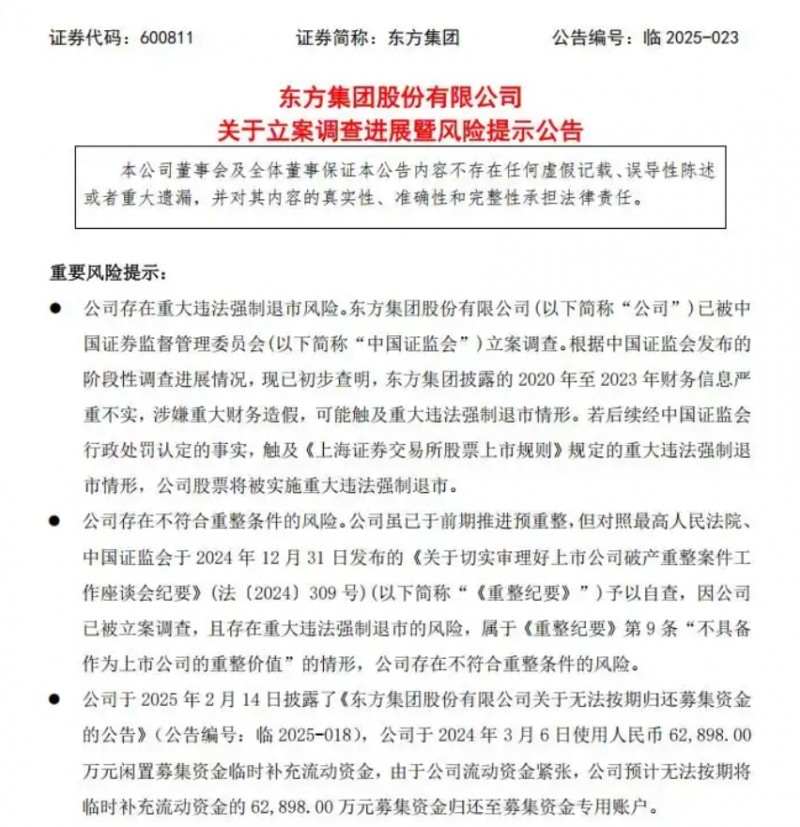 2月28日,东方集团发布公告,公司因2020年至2023年财务信息严重不实,涉嫌重大财务造假,可能触及重大违法强制退市情形。公司股票将被实施重大违法强制退市,且存在不符合重整条件的风险。同时,公司预计无法按期归还临时补充流动资金的6.29亿元募集资金。目前,证监会的调查尚在进行中,公司尚未收到就上述立案调查事项的结论性意见或决定。