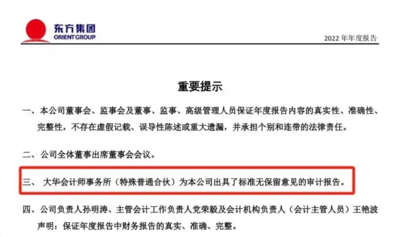 东方集团相关财报显示,2020年至2023年的4年财报审计机构为大华会计师事务所,其中在2020年至2022年的3年财报中,大华会计师事务所在均出具了标准无保留意见的审计报告。