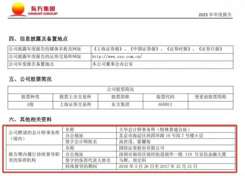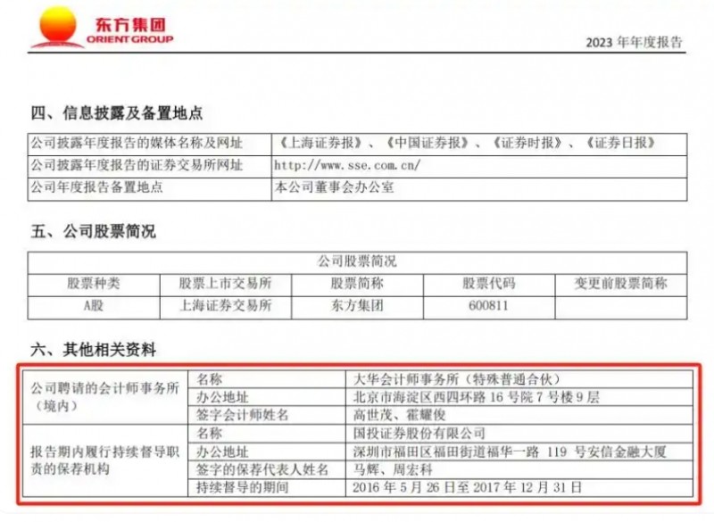 东方集团2023年及近年财报显示,报告期内履行持续督导职责的保荐机构是国投证券,但标明的持续督导的期间则是2016年5月26日至2017年12月31日。