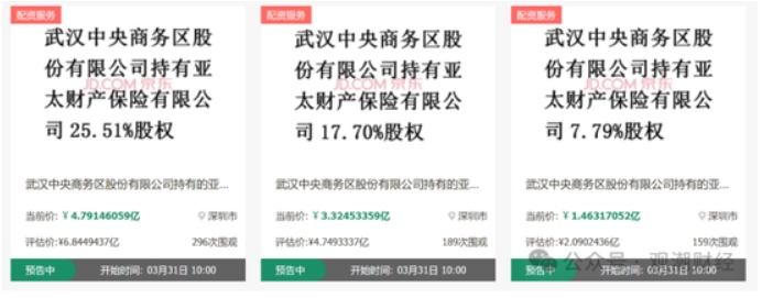 在刚刚过去的2月28日,京东司法拍卖平台发布三条股权拍卖信息:亚太财险最大控股股东武汉中央商务区所持有的51%股权被拆分为25.51%、17.70%、7.79%三笔,将于3月底在该平台公开拍卖,作价9.56亿元。