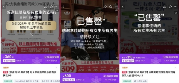 据了解,今年李佳琦直播间首日晚8点开启预售后,不到两小时内,毛戈平、珀莱雅、丝塔芙、阿迪达斯等品牌产品在上架后迅速售罄。国货表现尤其亮眼,老牌国货韩束、自然堂、双妹等消费者热度一路高涨,新锐国货品牌诸如听研、绽美娅等也展现出优异的种草能力,次抛产品售出件数均上万,消费者对实力国货持续青睐有加。