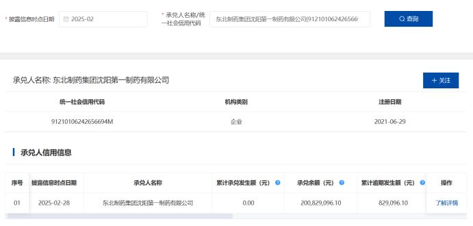 上海票交所的信息显示,截止到今年2月底,东北制药集团沈阳第一制药有限公司尚有82.9万元的票据出现了逾期,而且是持续多个月份出现逾期。
