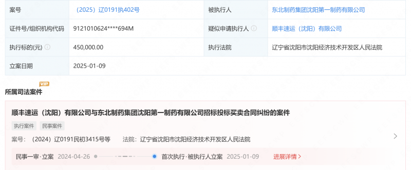 北制药集团沈阳第一制药有限公司,该公司不仅在今年1月份成为司法被执行人,执行金额45万元(执行文书号:2025辽0191执402号),而且该公司开出的商标出现了逾期。