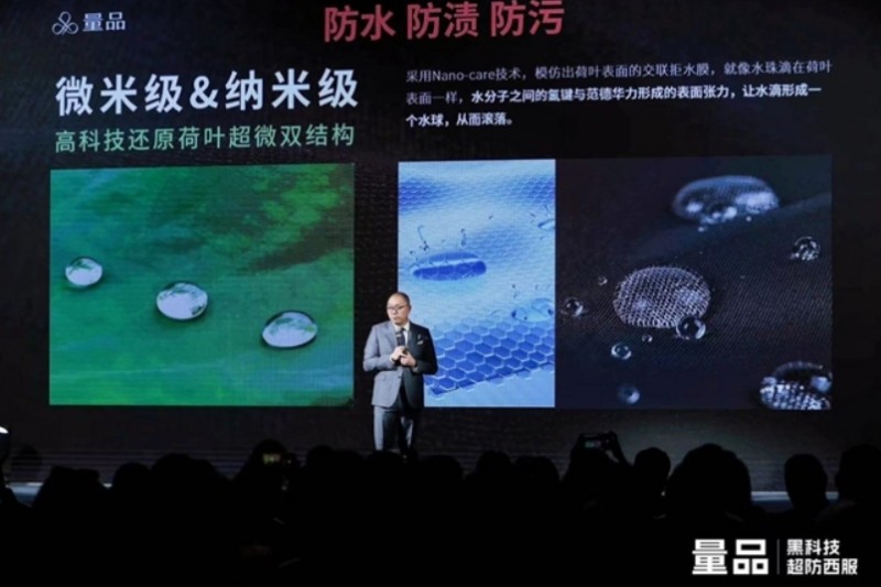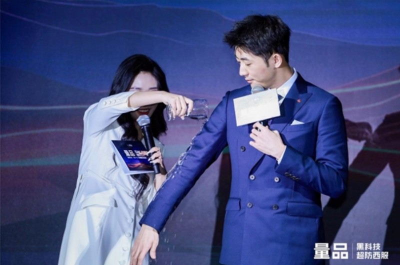 现场,大屏播放了“胡哥说科技”的测评视频,只见其身着该西服轻松驾驭意外泼水、污渍沾染、灰尘飞扬等生活场景。这不仅得益于新品采用了Nano-care技术,模仿出荷叶表面的交联拒水膜,还因其获得了斜纹织法的加持,如同故宫房顶上的琉璃瓦形成一道道水路,水性污渍呈水珠状顺着纹路迅速排掉,咖啡、红酒等污渍均可轻松抖落不留痕。他还通过非常规的暴力测试,对比量品与普通西服在防护性能上的数据差异,以科学佐证产品优势。