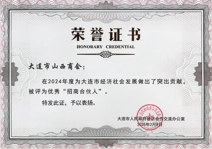 此次大连市山西商会获大连市优秀“招商合伙人”殊荣,将以此为新起点,继续发挥桥梁纽带作用,整合资源,为大连的经济发展、人才引进和城市宣传贡献更多力量!